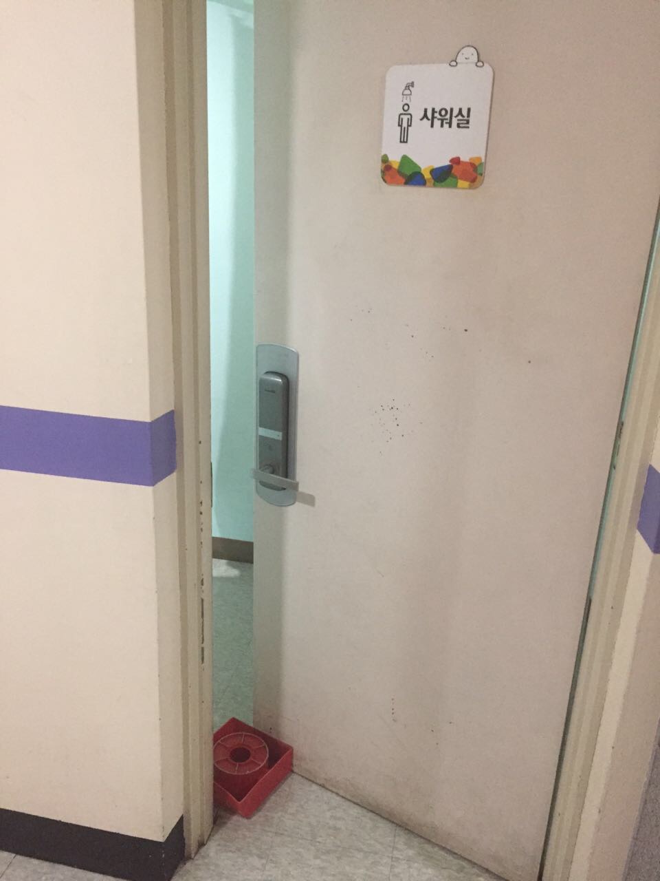 5층 남자 샤워장은 문을 닫아두면 습기가 엄청나서 견딜 수가 없습니다. 그래서 출입구 문을 열어두고 있는데.. 이 문을 고정하는 "도어스토퍼"를 하나 설치 부탁 드립니다.
