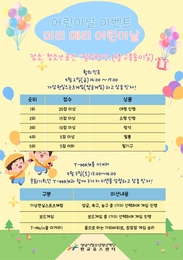 - 내 용: 5월 2일(금) - 가상현실스포츠게임(양궁게임) 하고 상품 받자!