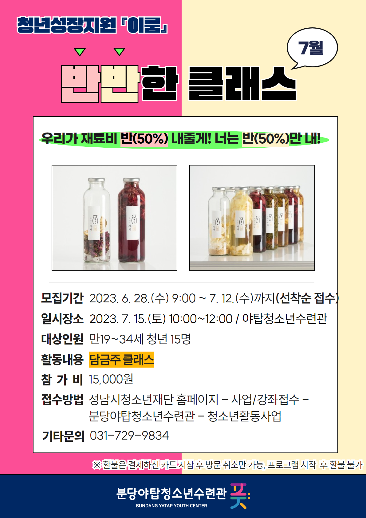 - 접수방법: 성남시청소년재단 홈페이지 - 사업/강좌접수 - 분당야탑청소년수련관 - 청소년활동사업 - 이룸 반반한 클래스