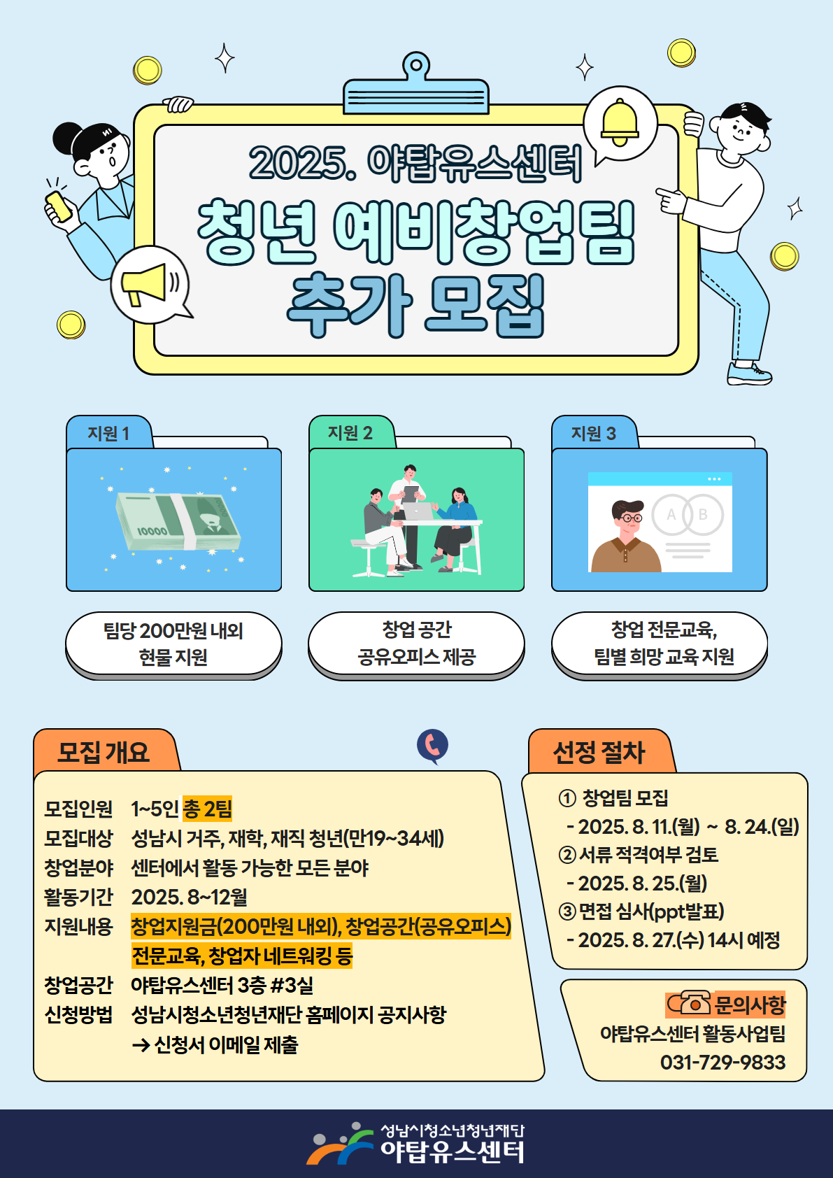 2025년 하반기 성남시청소년청년재단 야탑유스센터와 함께할 청년 예비창업팀을 다음과 같이 추가 모집하오니 청년들의 많은 관심과 참여 바랍니다.