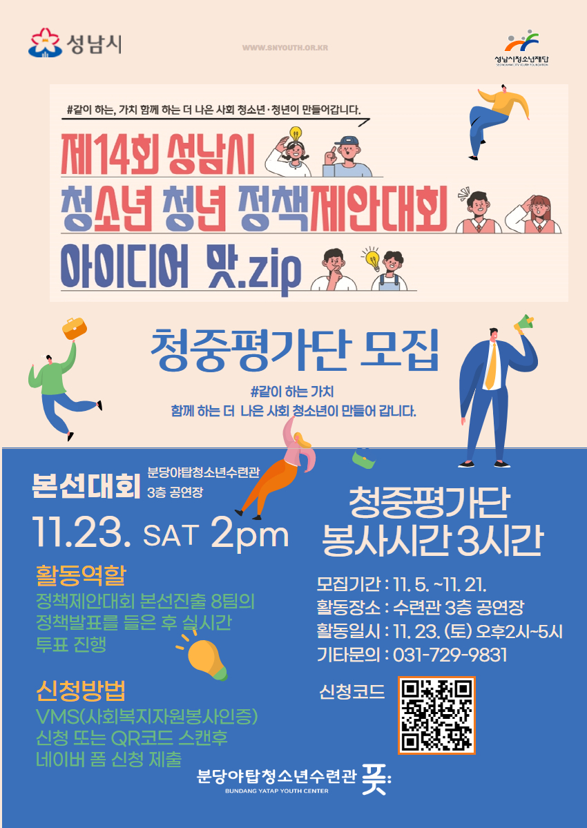 제14회 성남시정책제안대회 본선대회에 함께 참여하며 본선 진출 8팀의 정책제안을 듣고 공정하게 평가해주실 청중평가단을 모십니다.