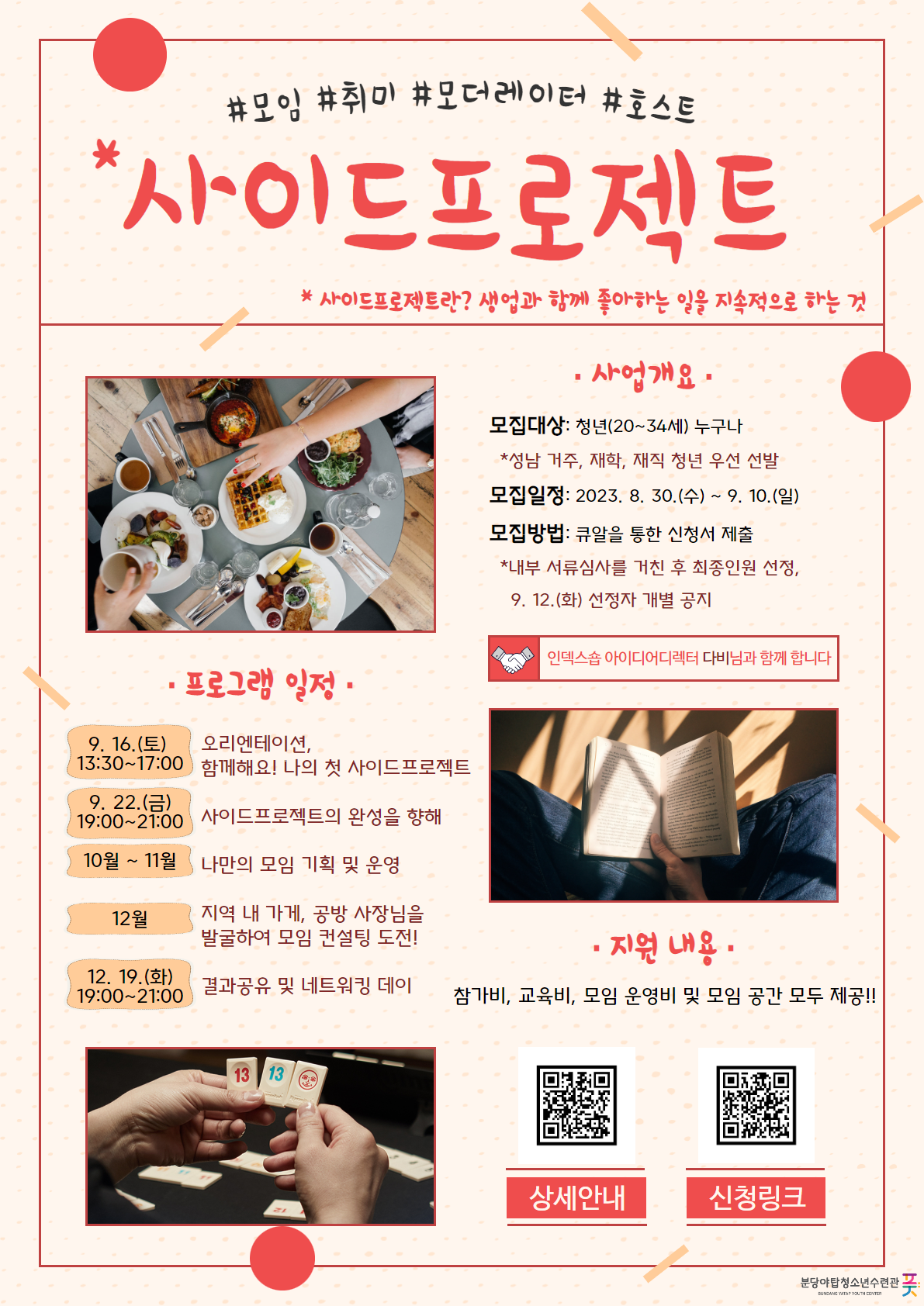 분당야탑청소년수련관에서는 청년들의 취미 및 관심사를 기반한 모임을 기획, 주도하는 모더레이터 양성을 하고자 합니다!