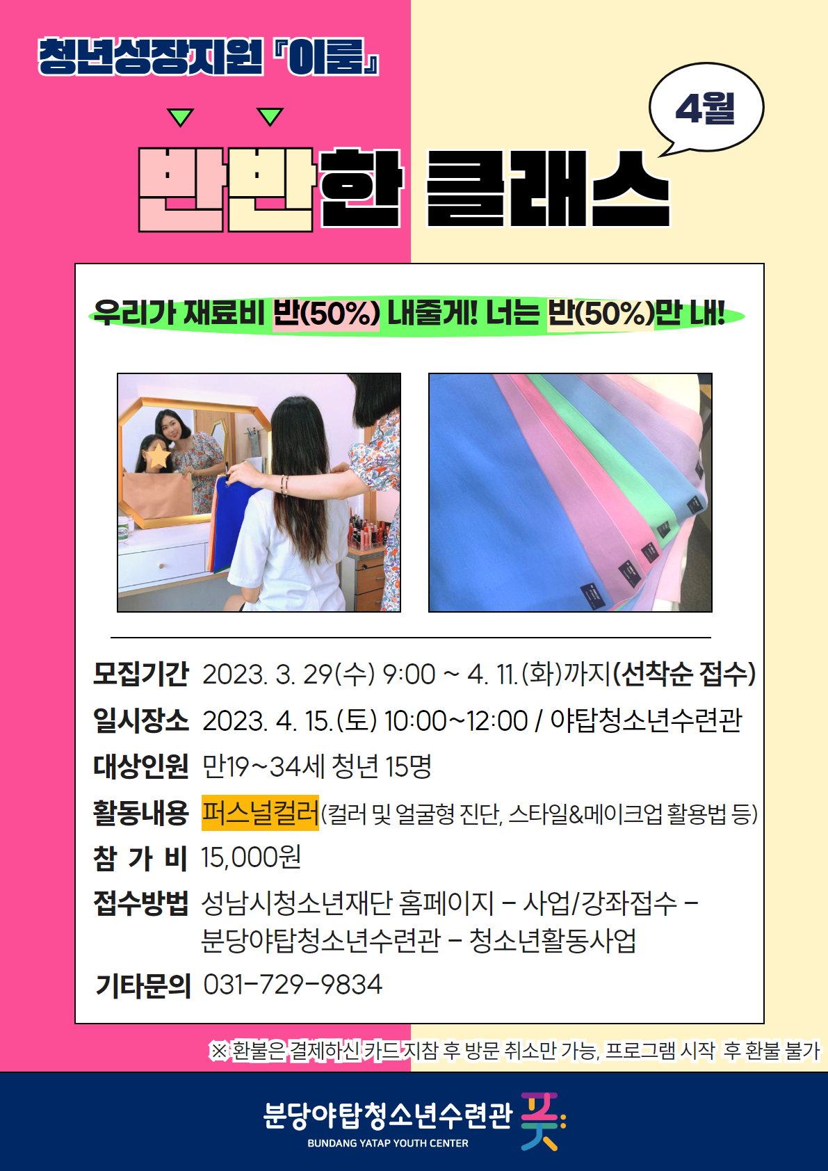- 일시장소: 2023. 4. 15.(토) 10:00~12:00, 야탑청소년수련관 1층 풋별별 카페