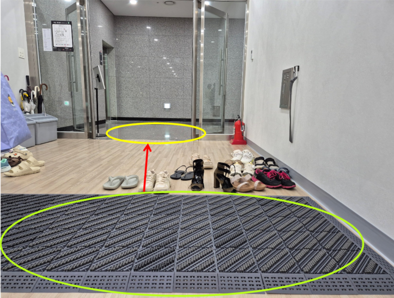 2. 해당 매트는 솔 매트로, 외부 이물질 유입 방지 및 유지·관리에 용이하며, 특히 이용자의 미끄러짐 등 안전사고 예방에 효과적인 제품으로 판단되어 설치하게 되었습니다.
