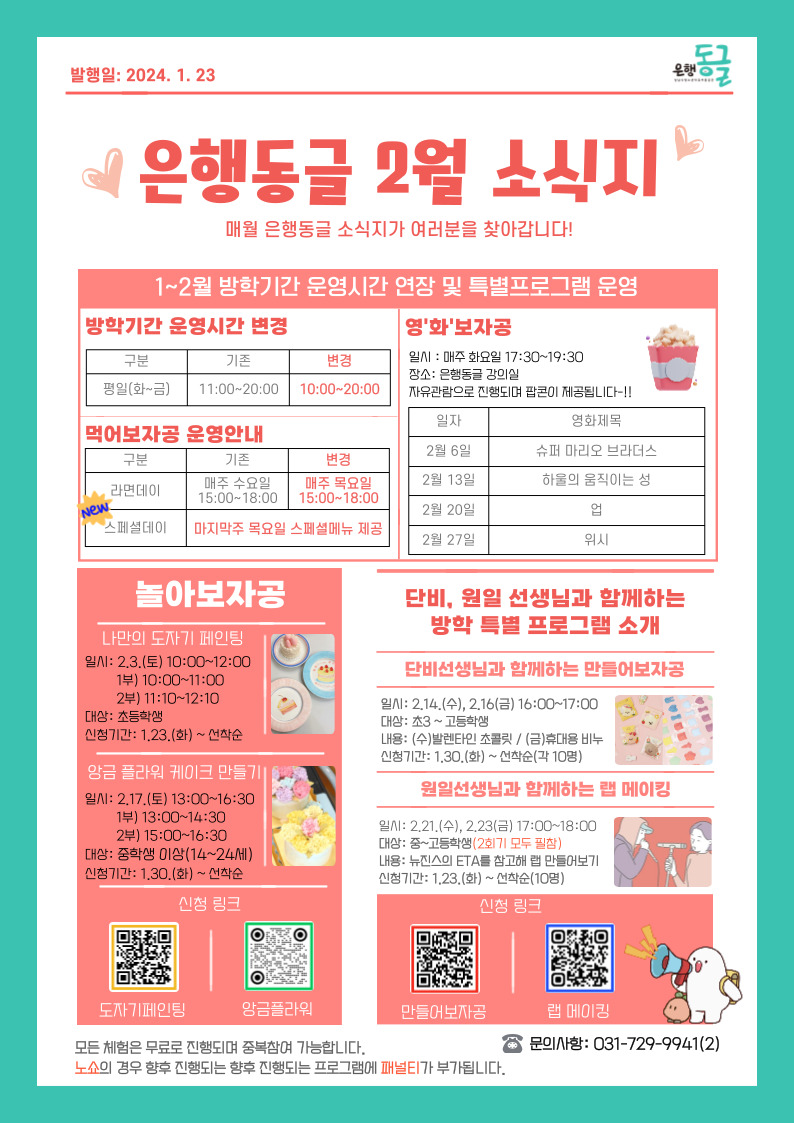은행동글 2월 소식지(겨울방학기간 특별 프로그램 안내)