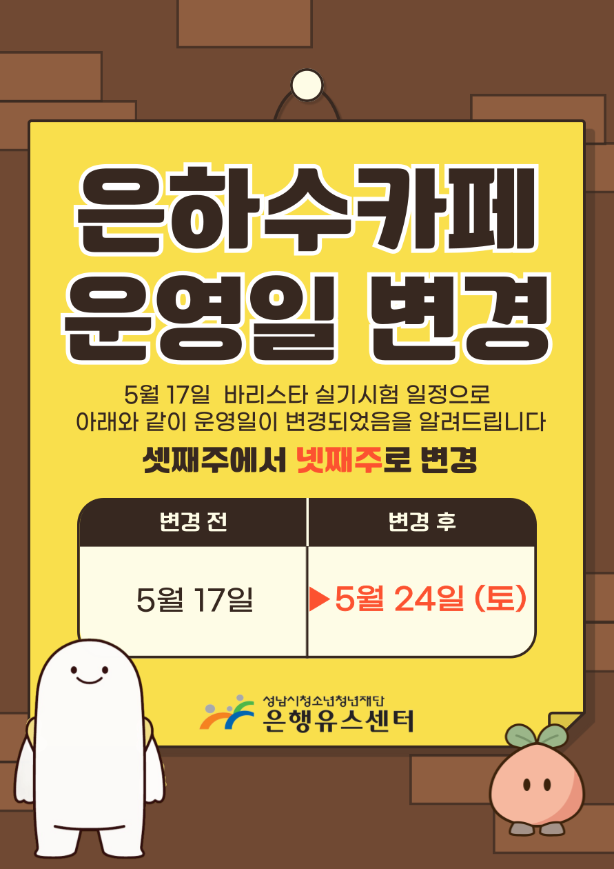 은행유스센터의 ★ 인기만점 ★ '은하수 카페' 일정 변경이 있어 안내드립니다.