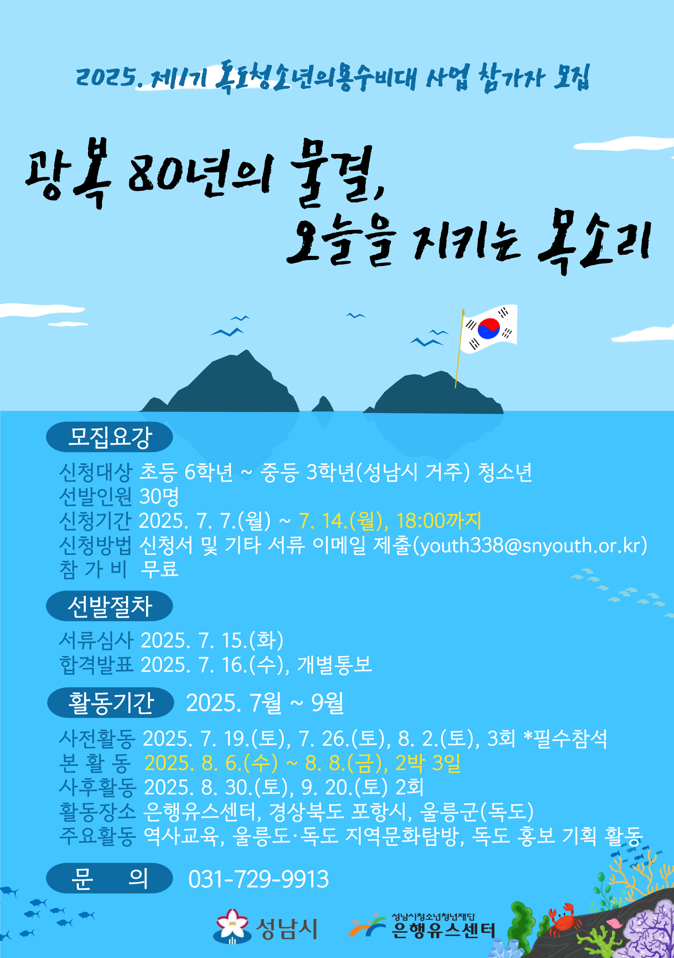성남시청소년청년재단 은행유스센터에서는 자매결연도시(울릉군)·독도 지역 탐방 및 독도 홍보 기획활동을 진행하고자 하는 성남시 청소년을 모집합니다.