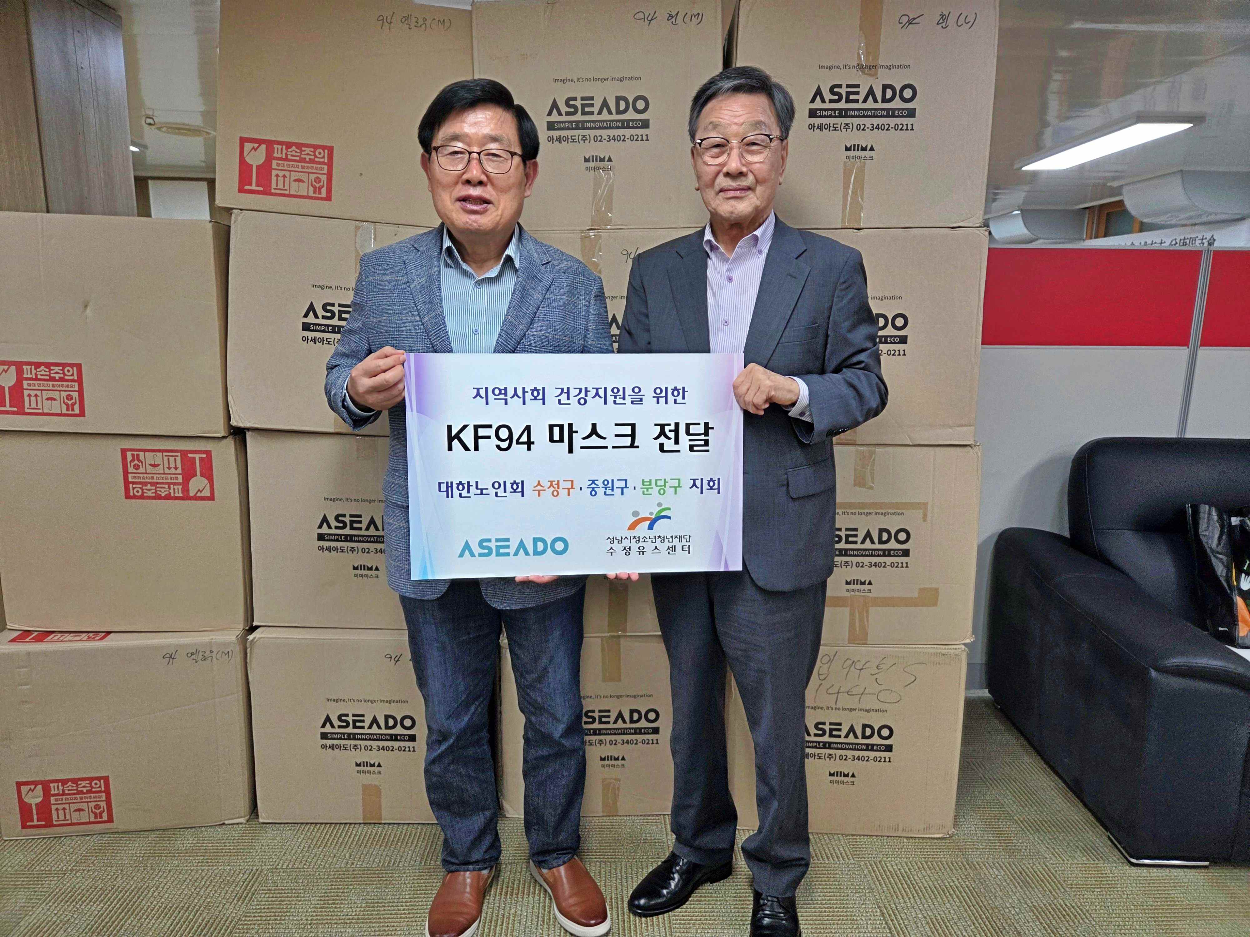 성남시청소년청년재단(대표이사 양경석) 수정유스센터는 지난 18일, 성남시 어르신들의 건강한 일상과 여름철 호흡기 건강 보호를 위해 아세아도 주식회사에서 기부받은 KF94마스크를 대한노인회 성남시 분당구 지회에 전달했다고 밝혔다.