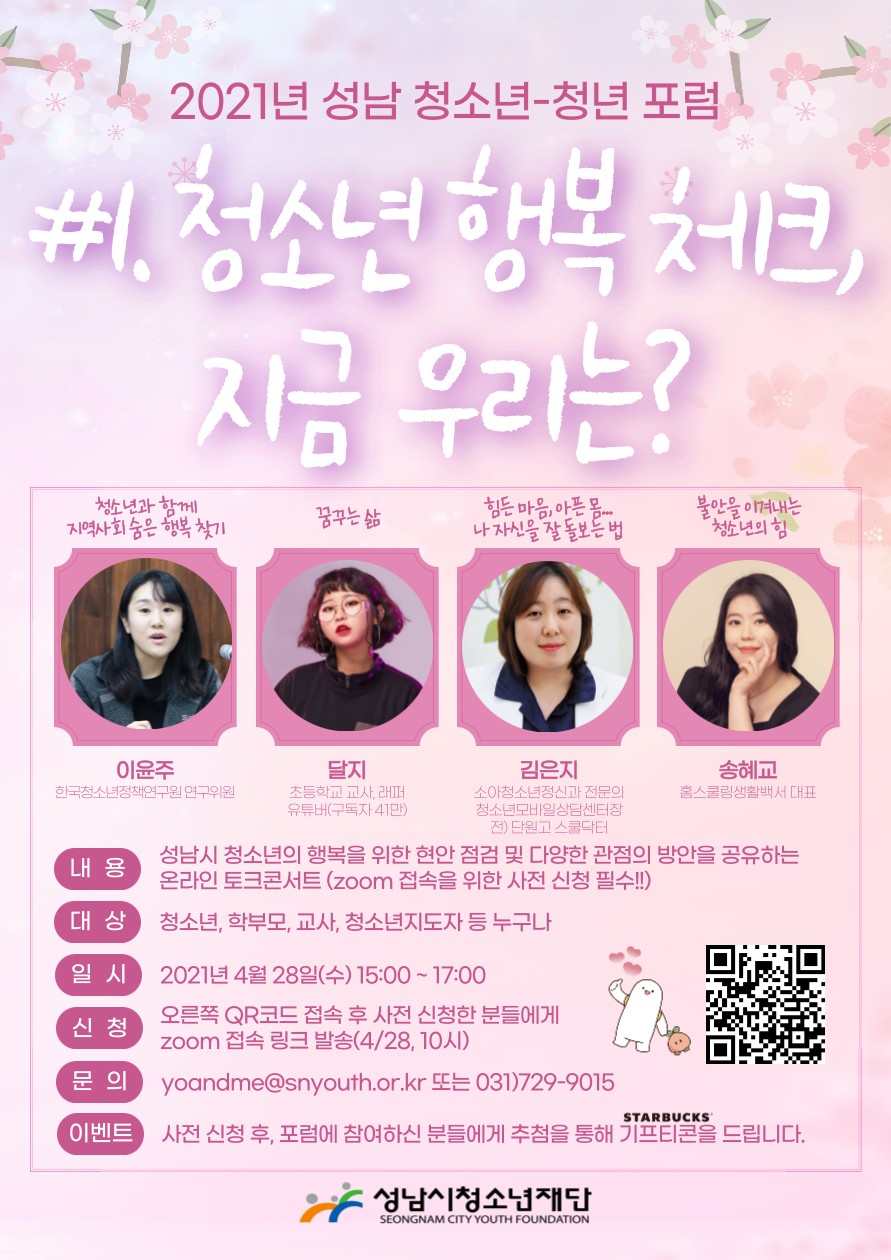 포럼에는 이윤주 한국청소년정책연구원 연구위원, 초등학교 교사이자 유튜버인 달지, 김은지 소아청소년정신과 전문의, 송혜교 홈스쿨링생활백서 대표가 참석해 각 분야의 다양한 시각으로 청소년 행복을 위한 강연과 토론을 펼칠 예정이다.