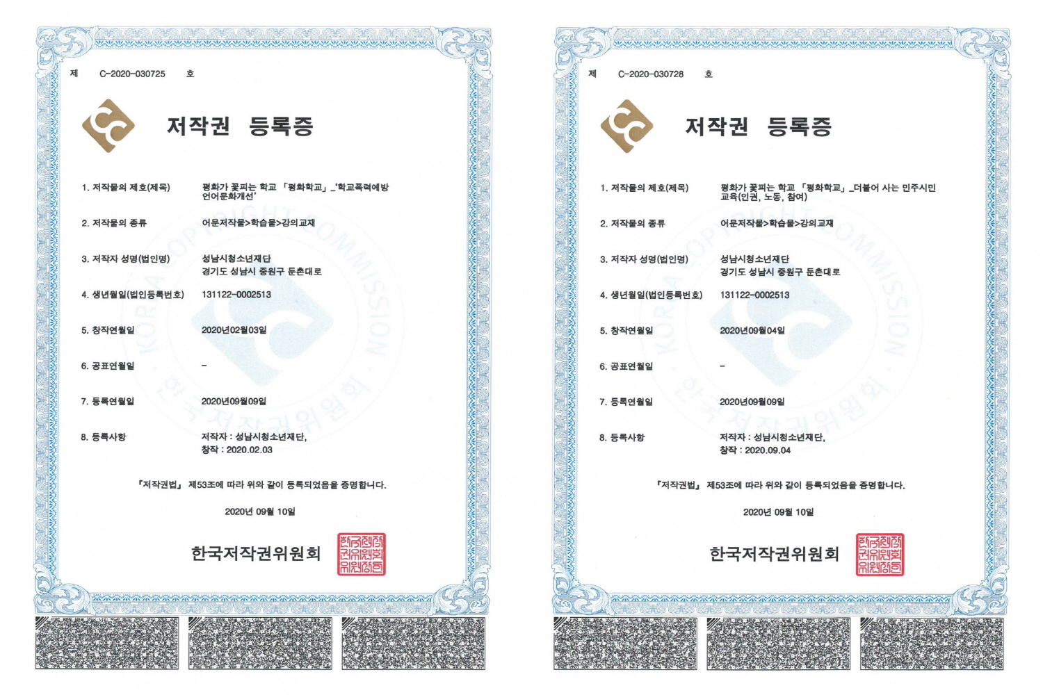 성남시청소년재단(대표이사 진미석)은 재단 자체 개발 사업 ‘평화가 꽃피는 학교『평화학교』’ 내 2개의 청소년프로그램, ‘학교폭력예방교육’과 ‘민주시민교육’ 에 대하여 저작권 등록을 마쳤다고 밝혔다. (저작권 등록번호 제C-2020-030725호, 제C-2020-030728호)