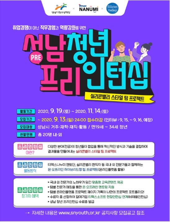 성남시청소년재단(대표이사 진미석)에서는 오는 9월 13일까지 실무 기반의 인턴십 연계형 프로젝트 「성남 청년 프리인턴십(pre-Internship)」에 참여할 만 19세 ~ 34세 청년을 모집한다고 밝혔다.