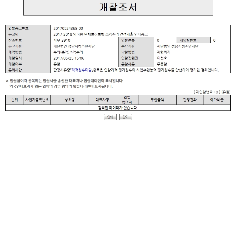 붙임 1. 입찰 및 개찰조서 각1부