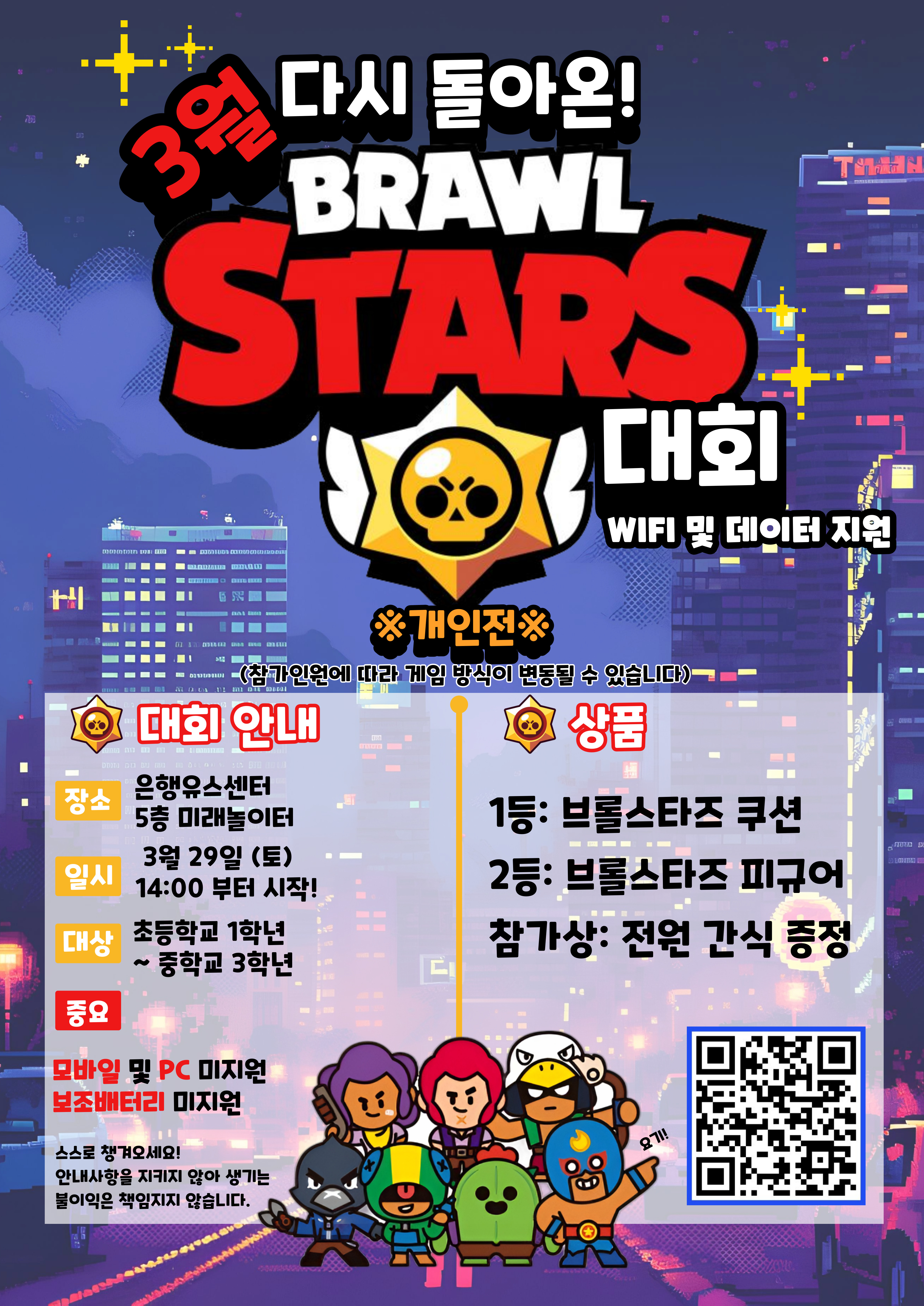 - 신청방법: 홍보포스터 내 큐알코드 접속 후, 신청서 작성!- 내용: 다양한 상품과 다시 돌아온! '브롤스타즈 대회'