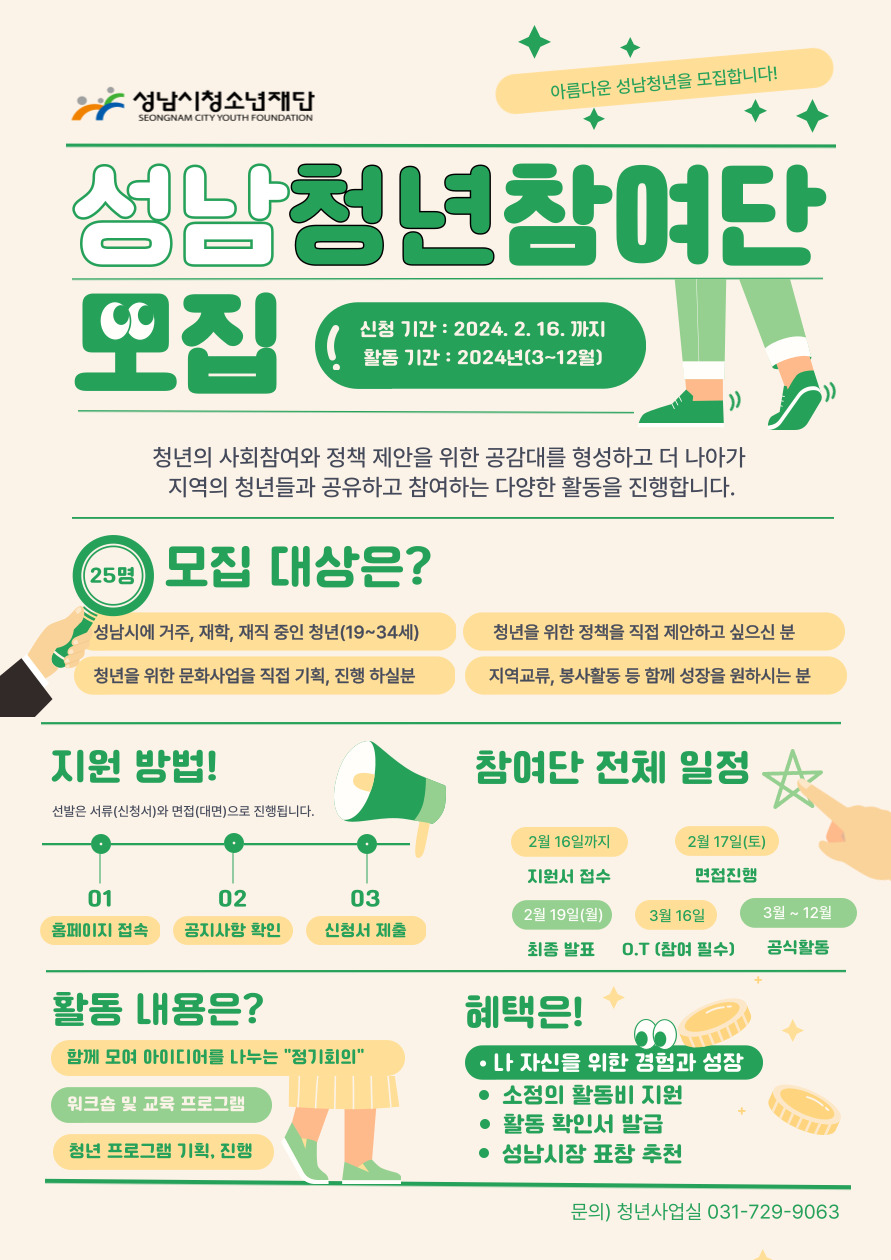 (재)성남시청소년재단에서는 청년이 지역사회 구성원으로서 다양한 분야의 현안 사항에 대해 청년의 시각으로 함께 논의하고 제안하는 정책 참여조직인 제4기 청년 참여단을 구성ㆍ운영하고자 모집합니다. 이에 역량 있는 성남시 청년 여러분의 많은 관심과 참여 바랍니다.