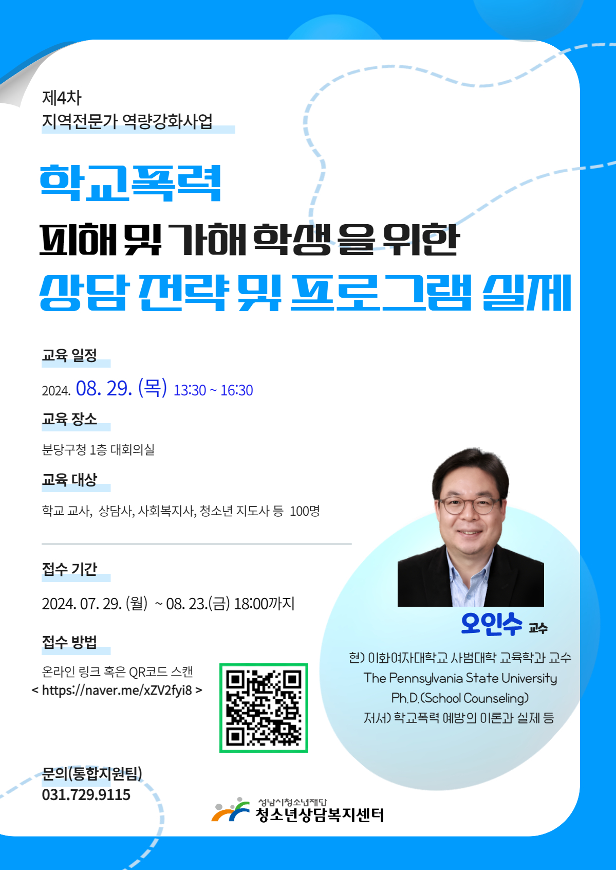 성남시청소년상담복지센터에서는 지역전문가역량강화사업 [ 제4차 학교폭력 피해 및 가해 학생을 위한 상담 전략 및 프로그램 실제] 교육을 운영합니다.