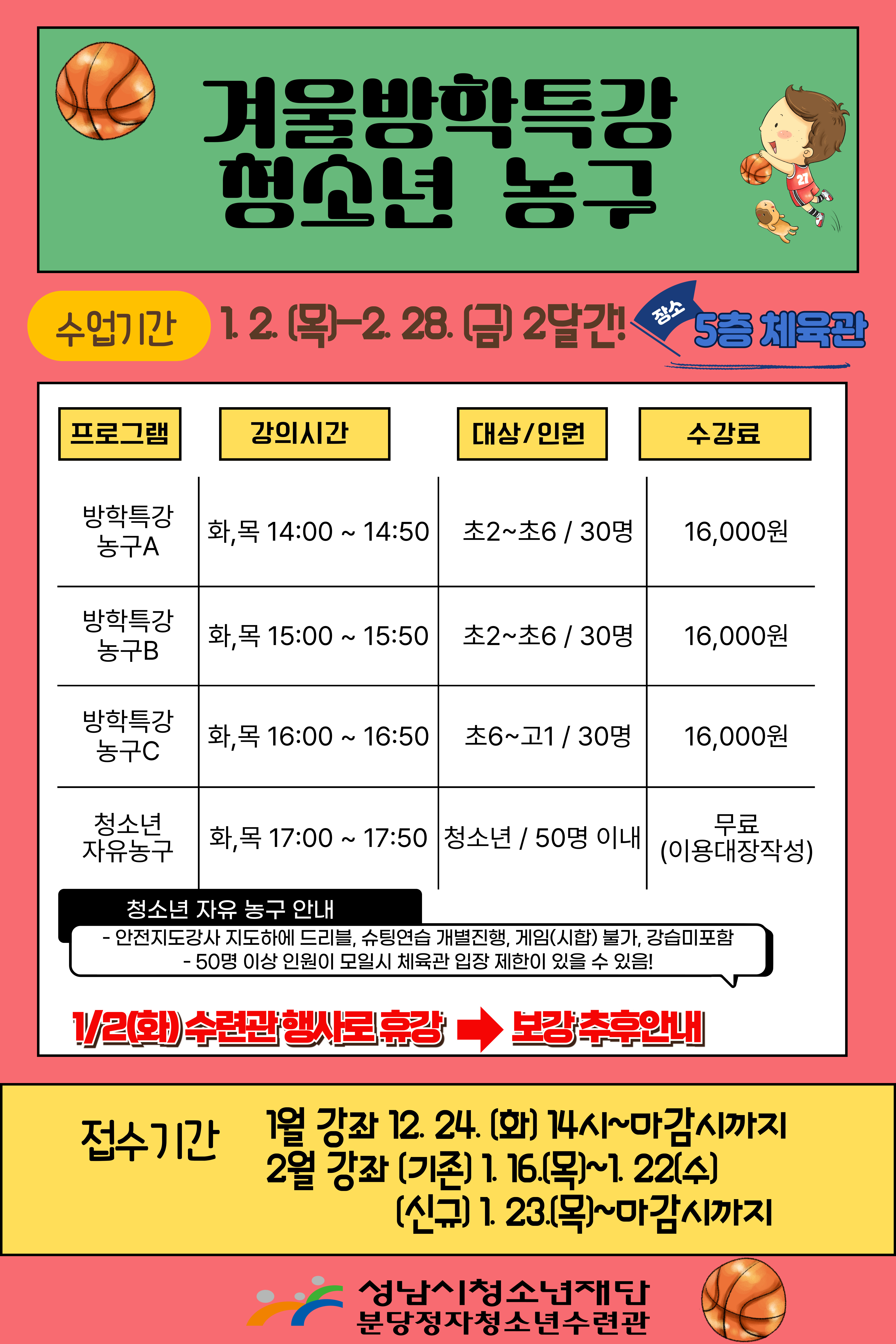 청소년 농구 | 화,목 | 14:00~14:50 | 초2~초6 | 30 | 체육관 (5층) | 16,000 |