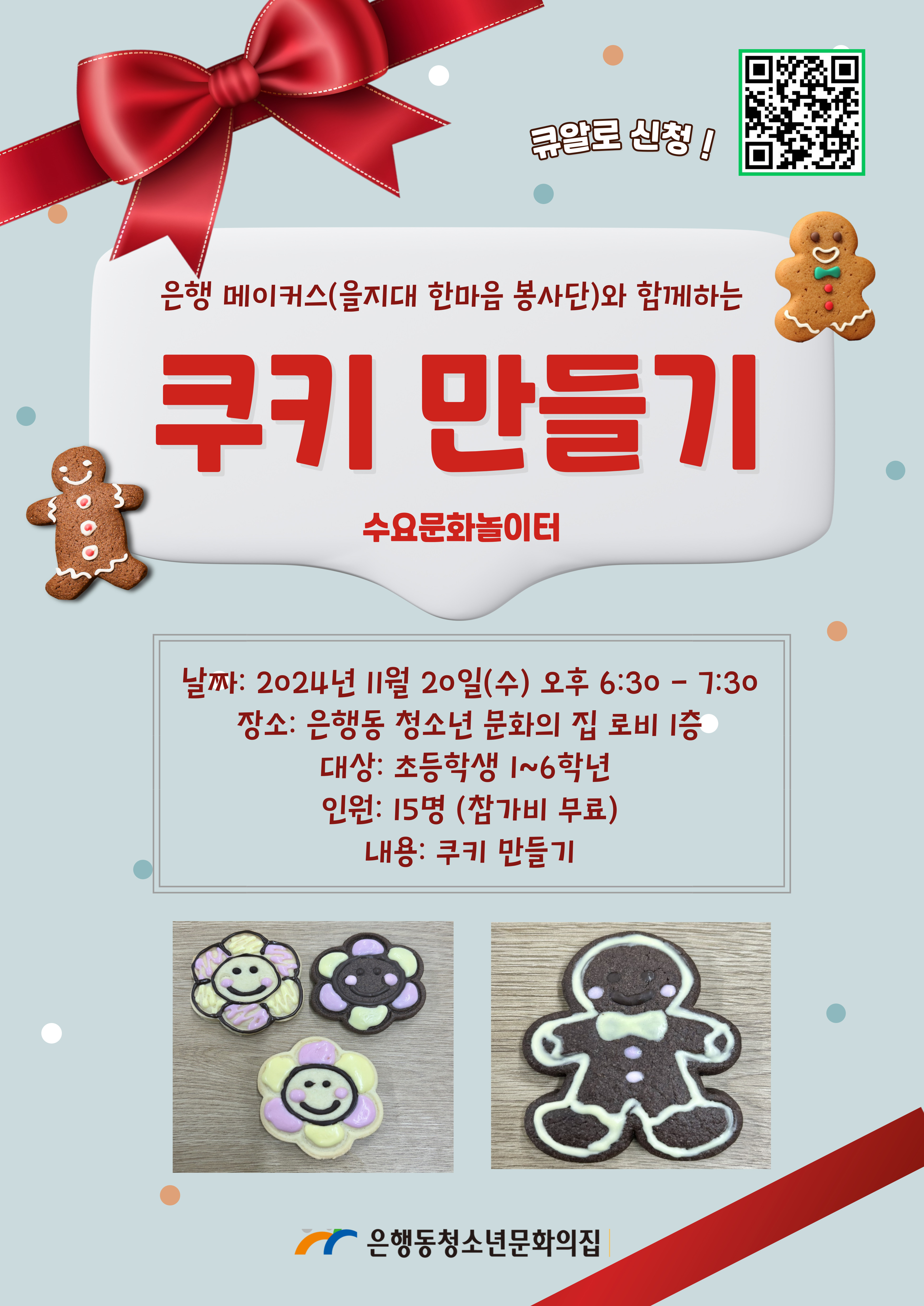 - 내용: 은행 메이커스(을지대 한마음 봉사단) 대학생 언니, 오빠와 함께하는 맛있는 와삭바삭 쿠키 만들기