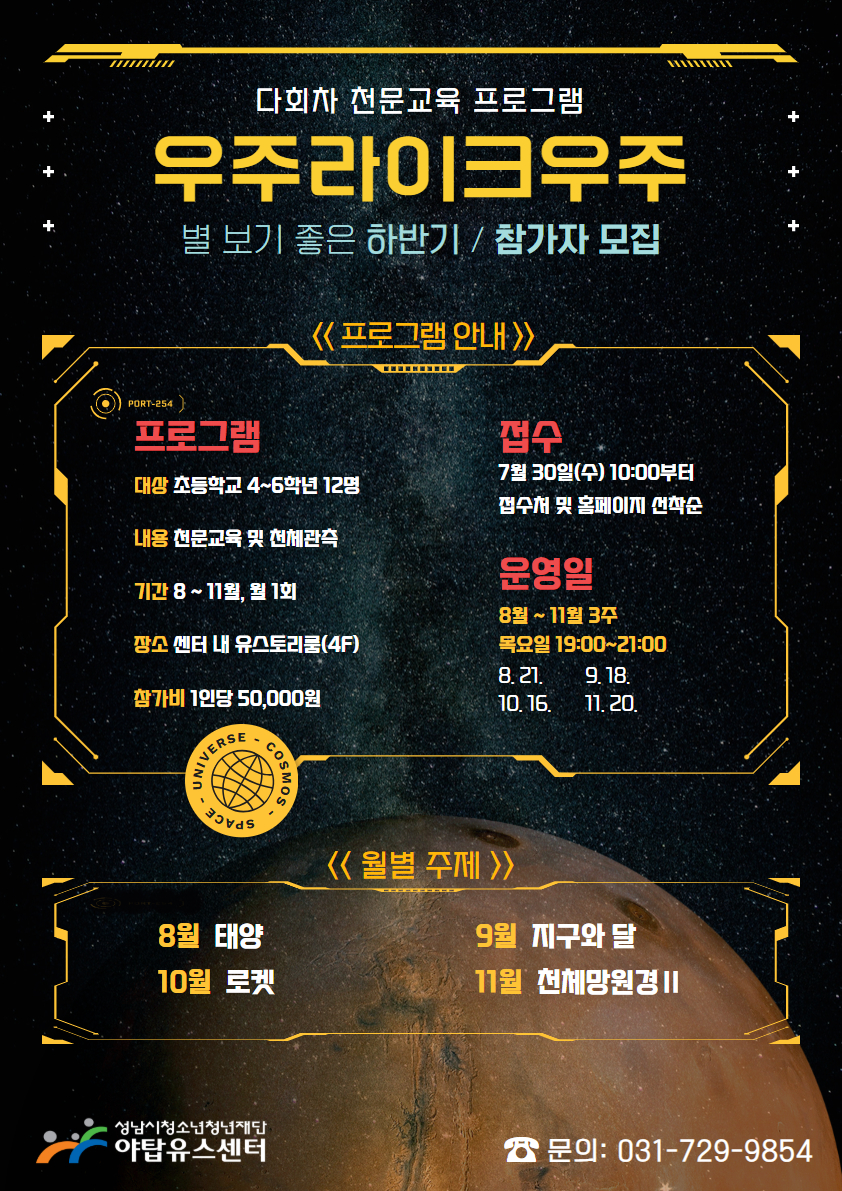 다회차 천문교육프로그램 「우주라이크우주」하반기 참가자 모집