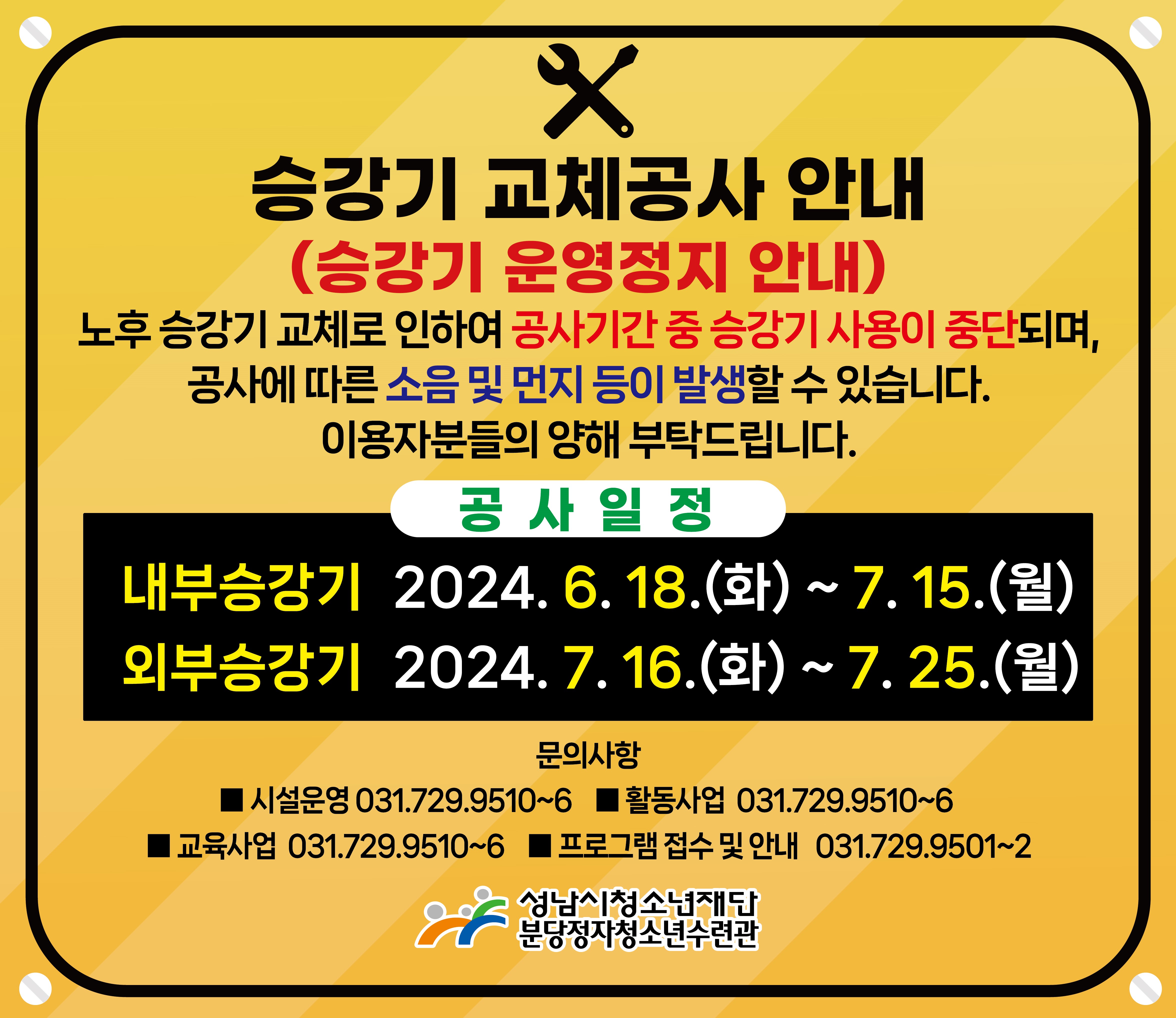 내부 승강기 공사 기간: 2024년 6월 18일 (화) ~ 2024년 7월 15일 (월)