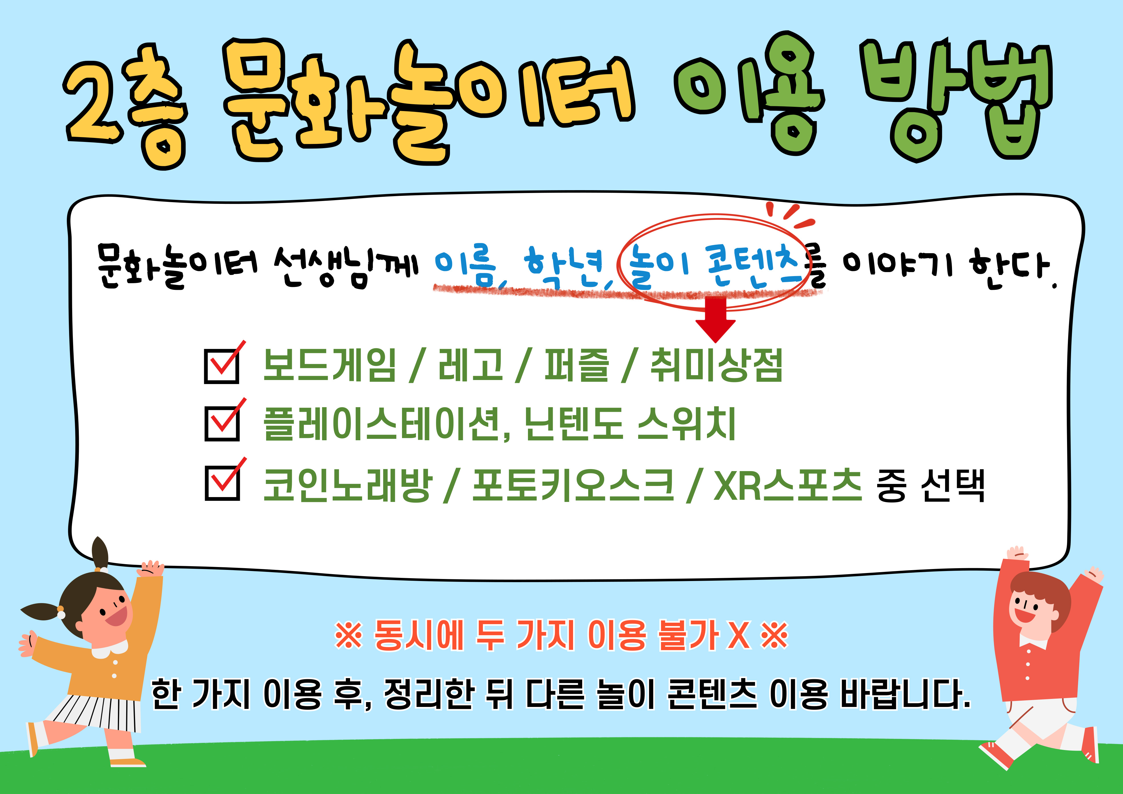 ▶ 이용방법 : 1) 문화놀이터 선생님께 이름 / 학년 / 놀이 콘텐츠 를 이야기 한다.