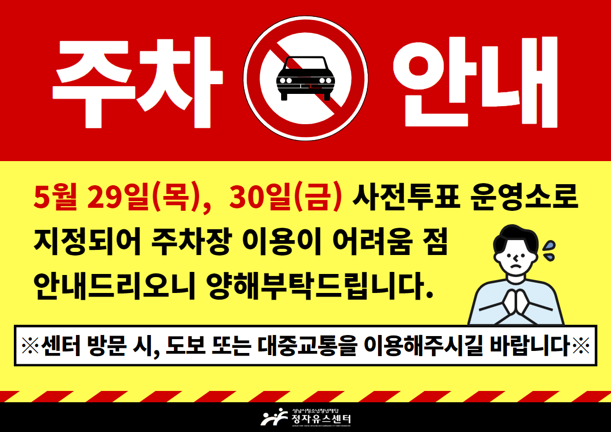 정자유스센터가 5/29~30일까지 사전투표소로 이용됨에 따라 센터 내 주차장 이용이 제한됩니다.
