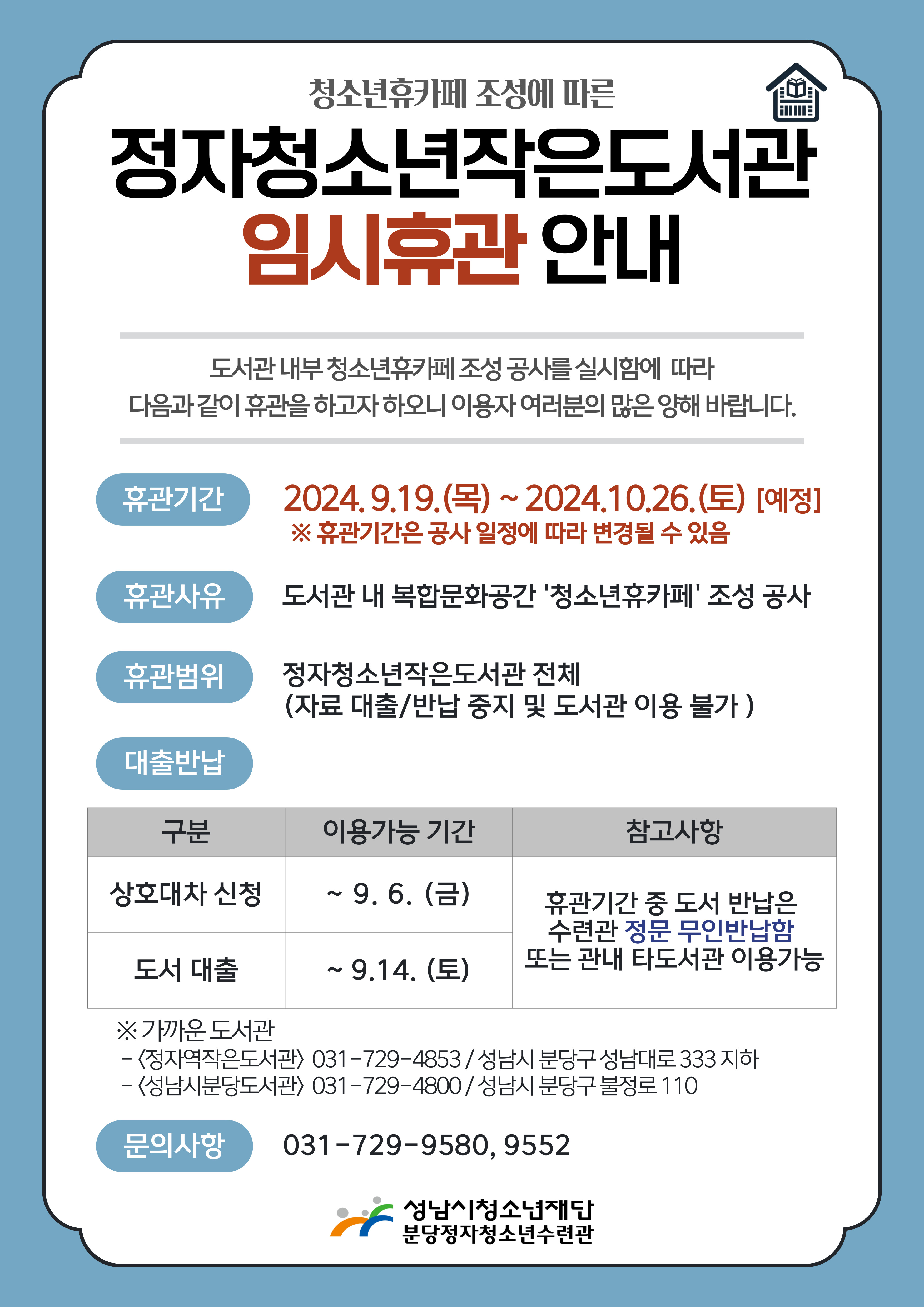 ○ 휴관범위: 정자청소년 작은도서관 전체(자료 대출/반납, 상호대차 등 도서관 이용 불가)