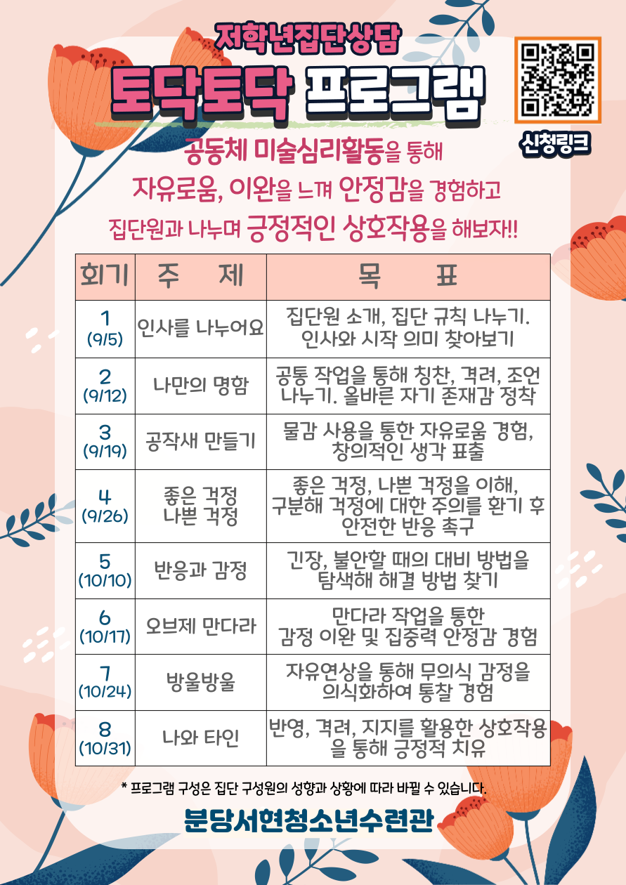 또래 친구들과의 '의사소통'과 '건강한 교류'에 관심이 있는 초등학생들을 위한 2024년 9, 10월 집단상담 프로그램 접수 안내드립니다