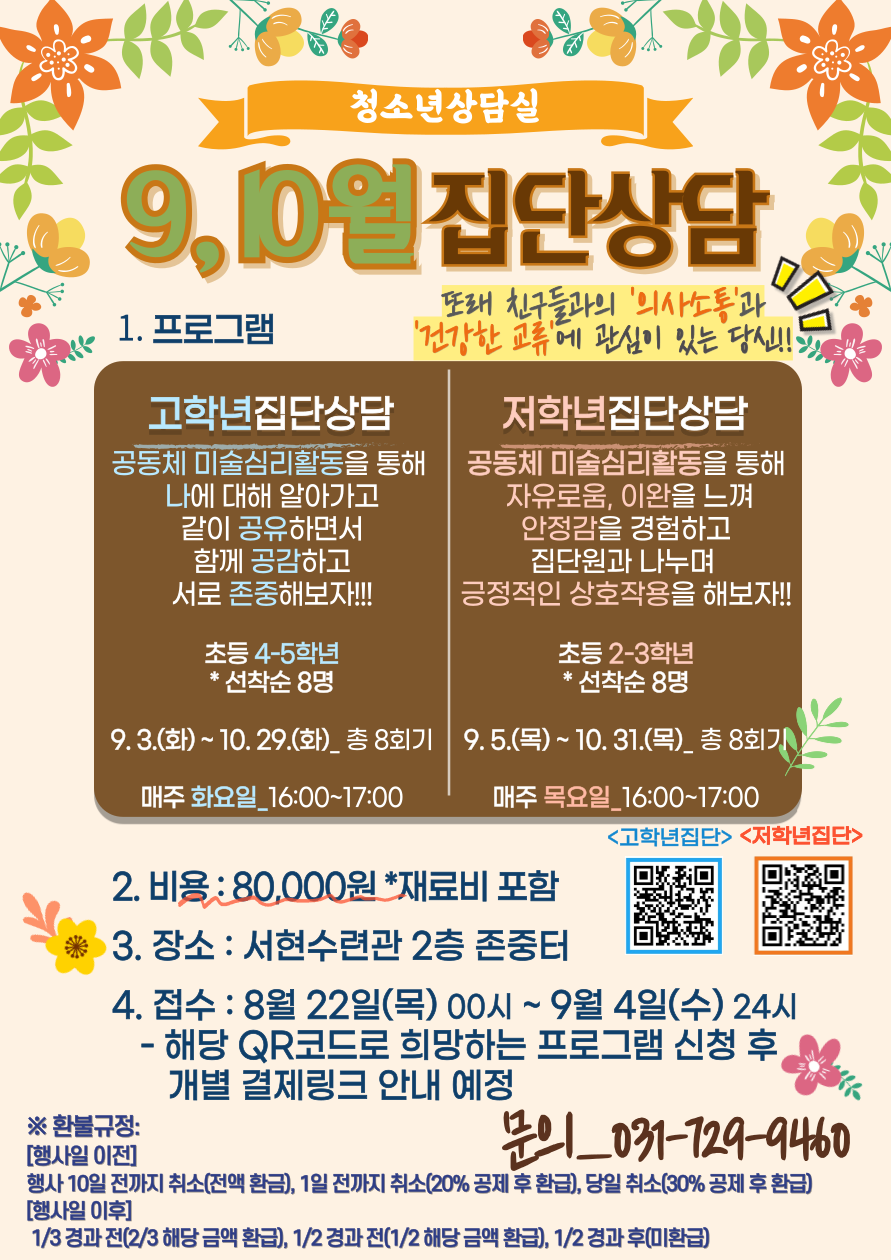 집단상담 접수는 8월 22일(목) 00시부터 9월 4일(수) 24시까지 네이버 폼으로 신청이 가능합니다!