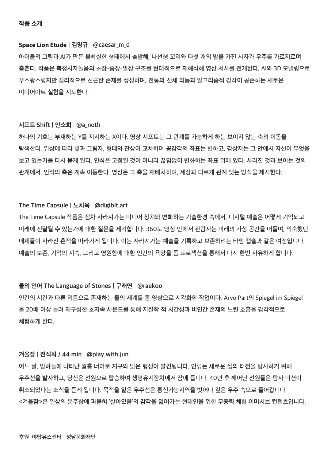 - 내용: 2025년 업스케일링 성남 커뮤니티 프로젝트에 참여했던 작가들이 모여 '시간'을 탐구하는