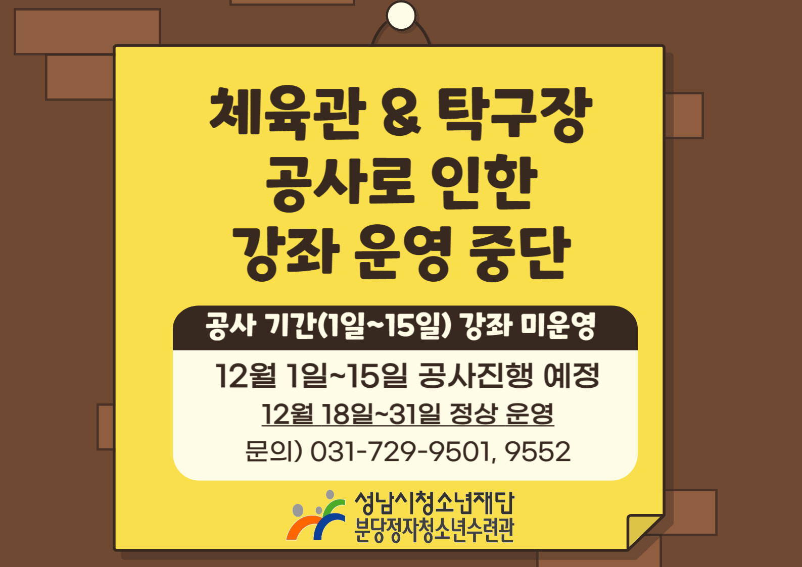 ※ 12월 체육관과 탁구장이 공사예정으로 2주간 수업진행이 불가합니다.