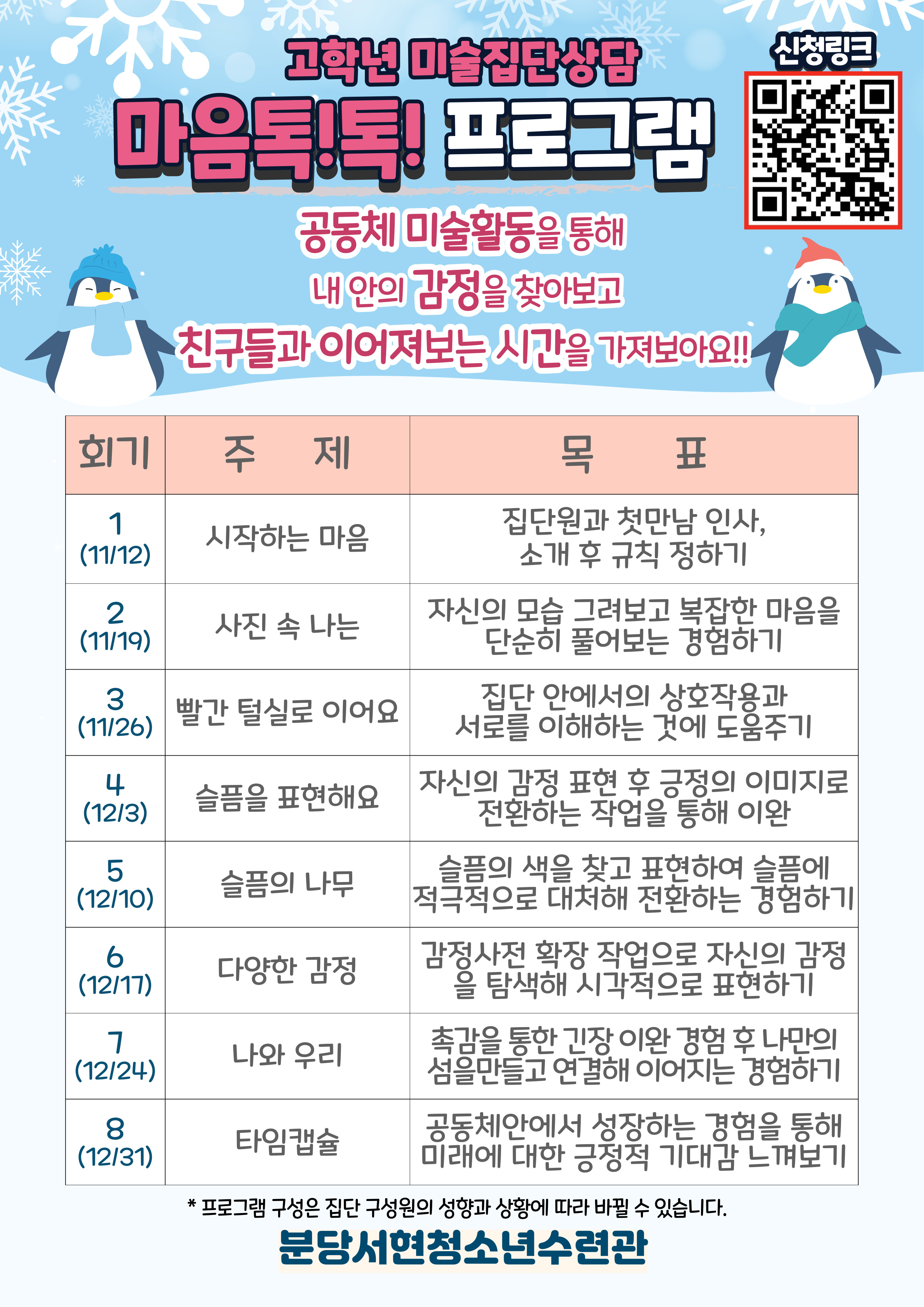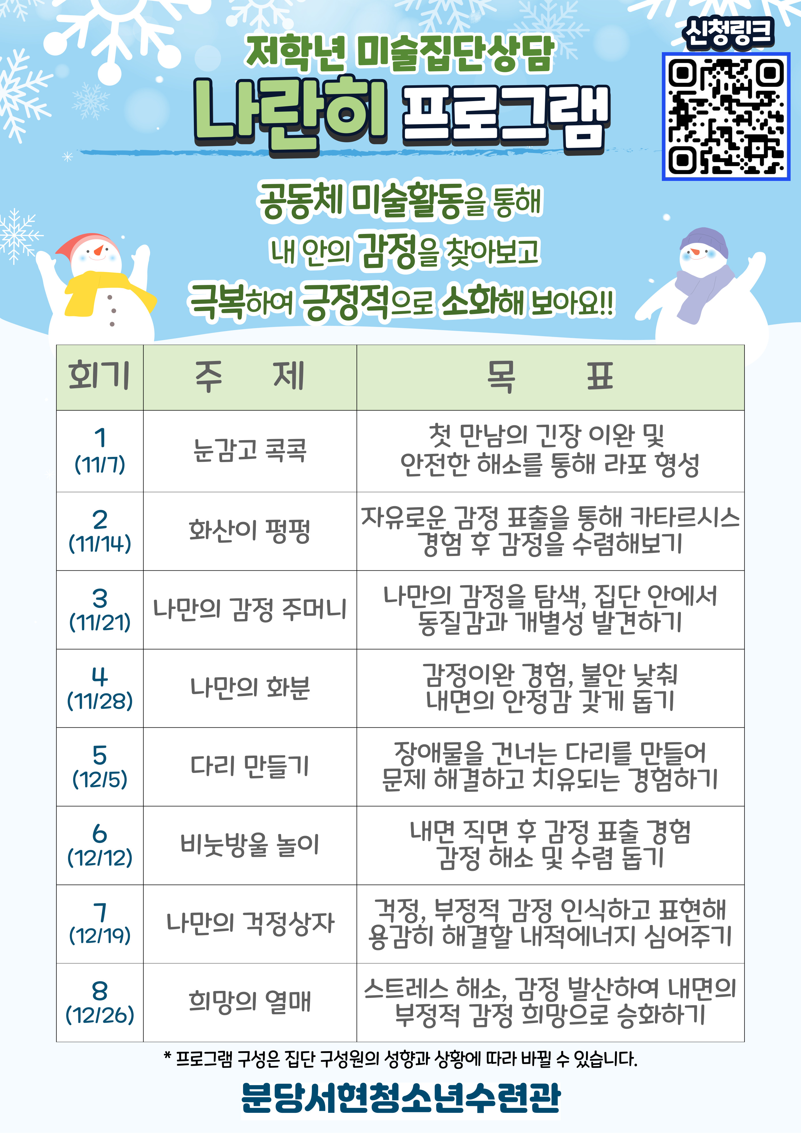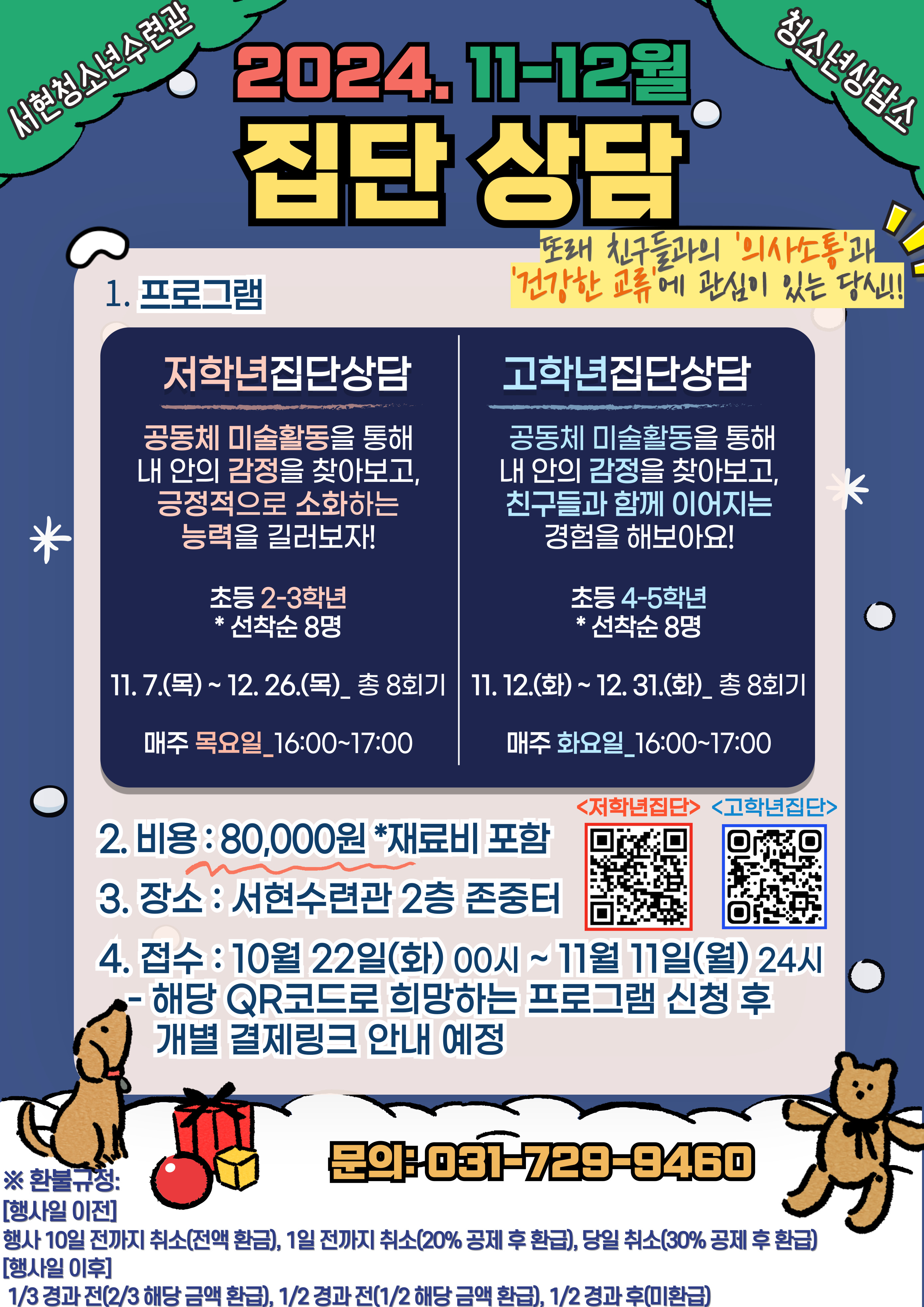 또래 친구들과의 '의사소통'과 '건강한 교류'에 관심이 있는 분들을 위한 2024년 11, 12월 마지막 집단상담 프로그램 접수 안내드립니다.