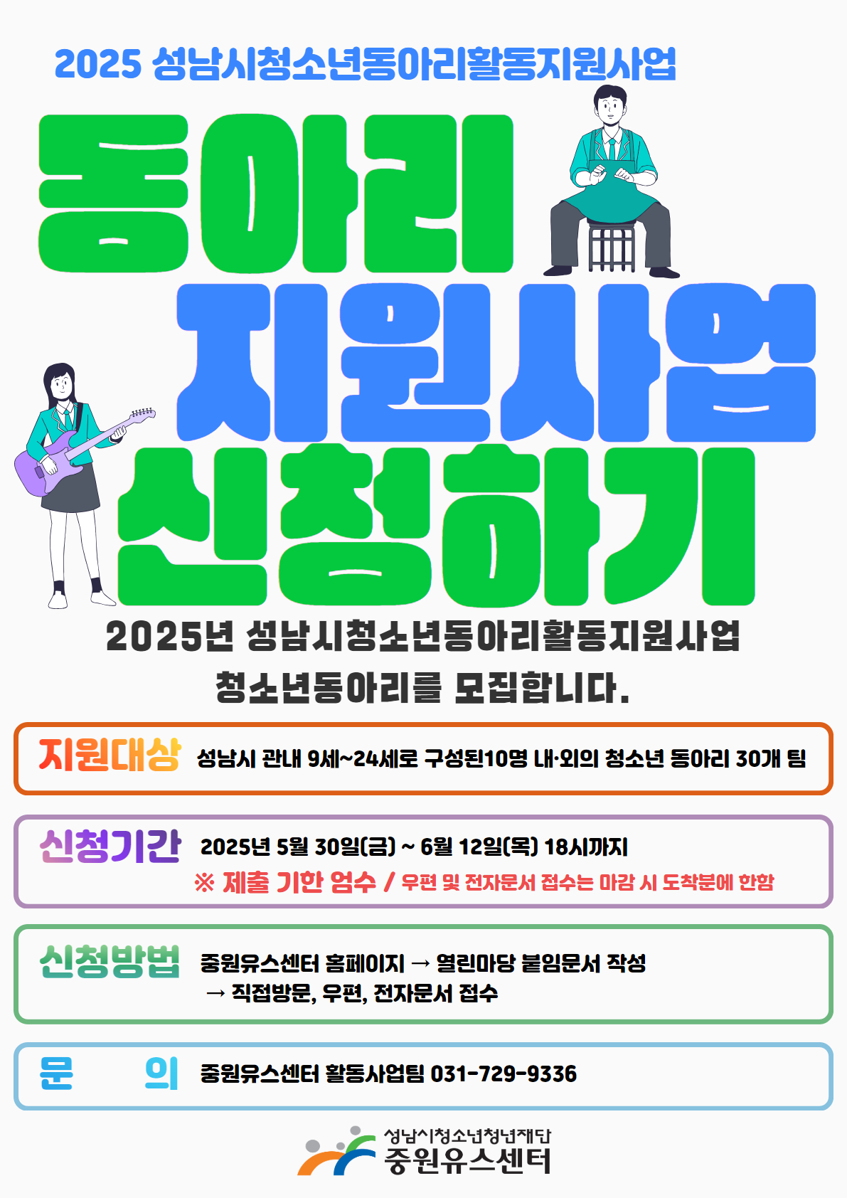 1. 성남시청소년청년재단 중원유스센터에서는 건전한 청소년 동아리 문화 및 지역 청소년 문화 활성화에 기여하고자 「2025년 성남시 청소년동아리활동지원사업」을 다음과 같이 운영합니다.