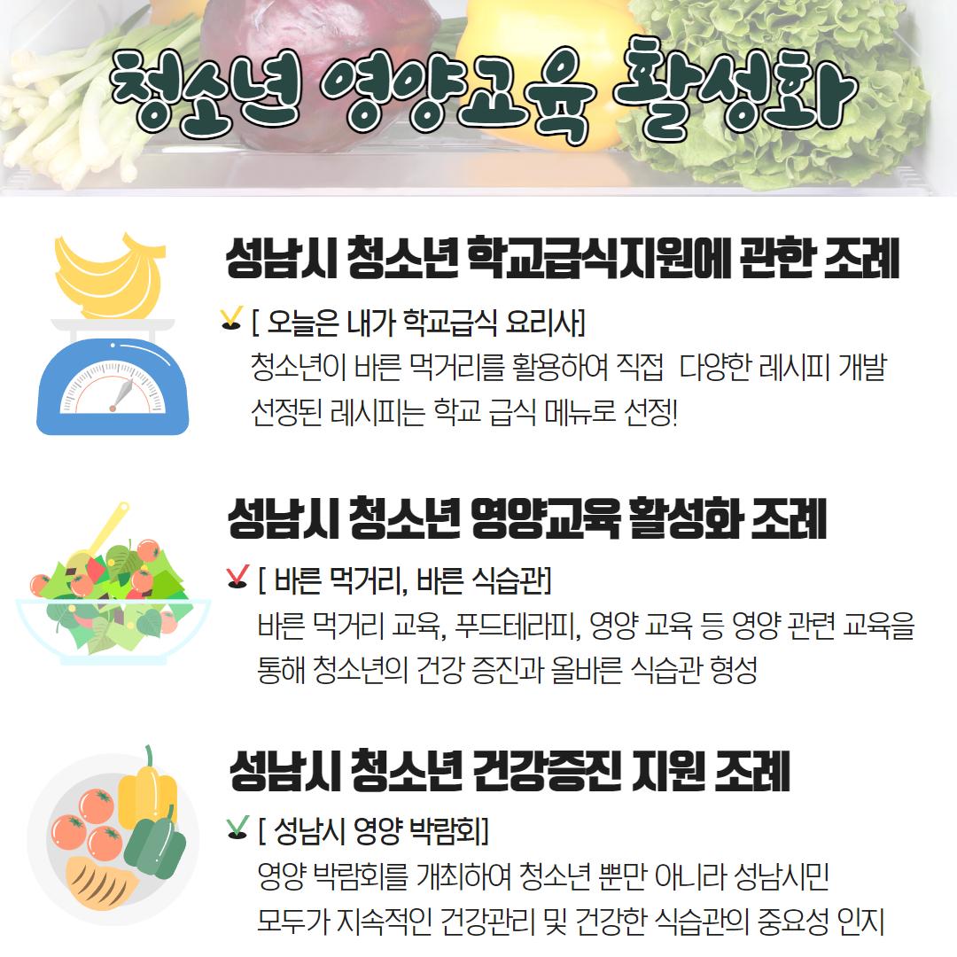 현재 성남시는 ‘성남시 청소년 건강증진 지원 조례’와 ‘성남시 학교급식지원에 관한 조례’가 제정되어 있다. 더불어 ‘성남시 청소년 영양교육 활성화 조례’안 제정과 각 조례에 근거하는 사업을 제안하여 성남시 청소년들의 생애주기별 올바른 식습관 형성 및 영양 교육 활성화를 지원하고자 한다.