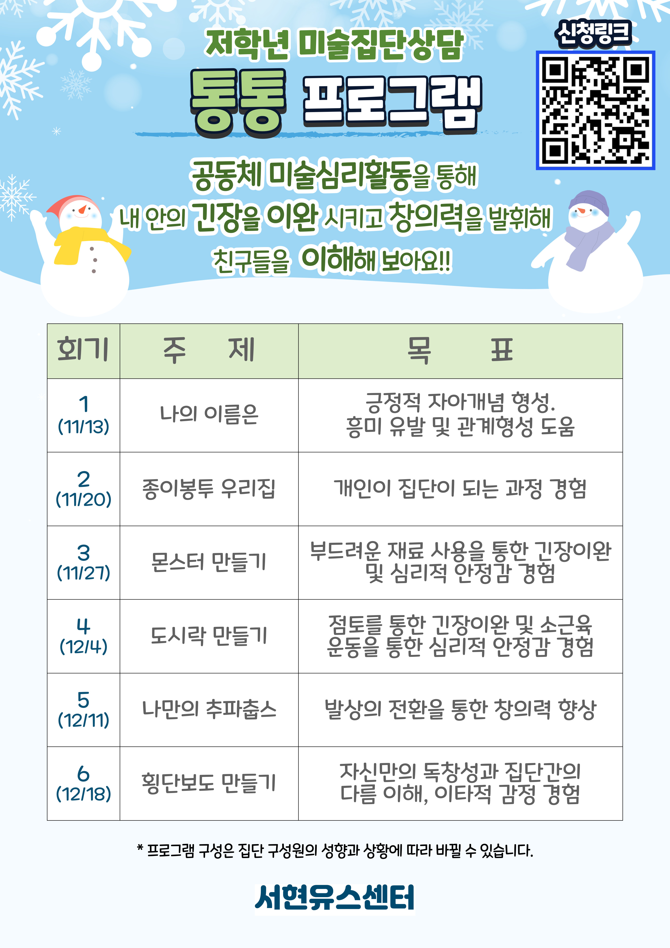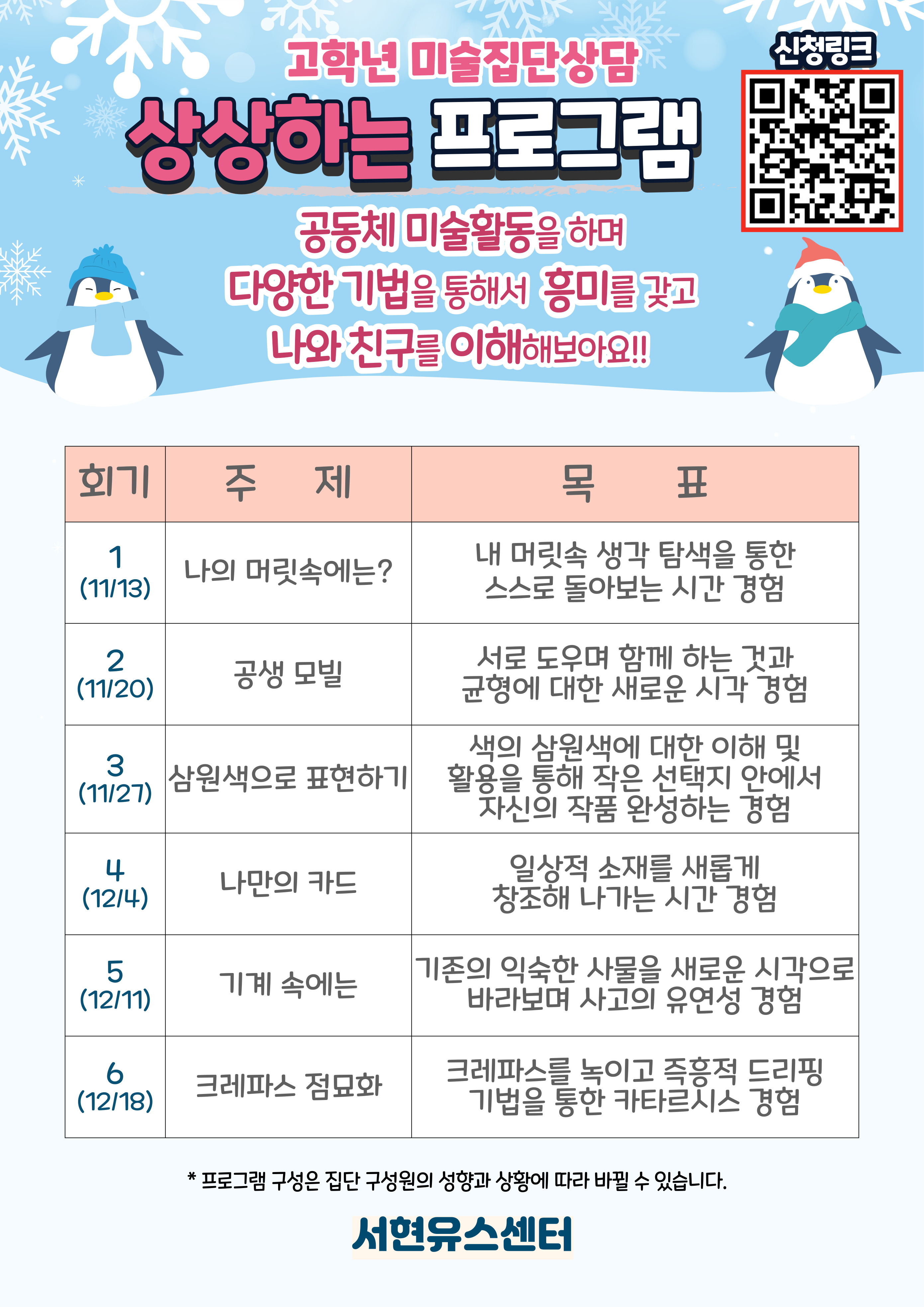 ○ 일정 : 11. 11. (화) ~ 12. 16. (화)_총 6회기, 매주 '화'요일 16:00 ~ 17:00