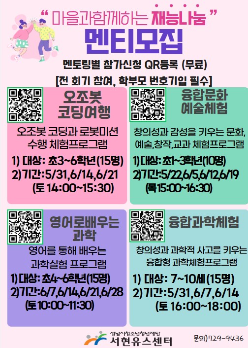 총4개의 청소년 멘토단이 진행하는 다양한 분야의 체험이 열립니다!