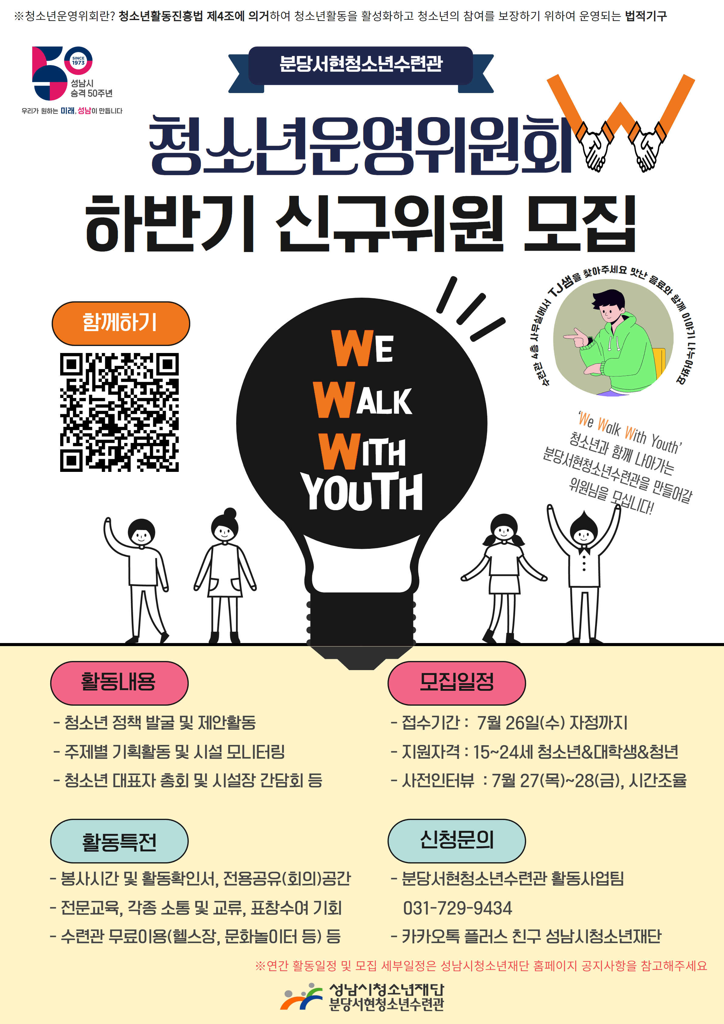 - 7월 27일(목)~28일(금), 이틀 중 시간협의, 분당서현청소년수련관 2층 청소년운영위원회실(참여터)