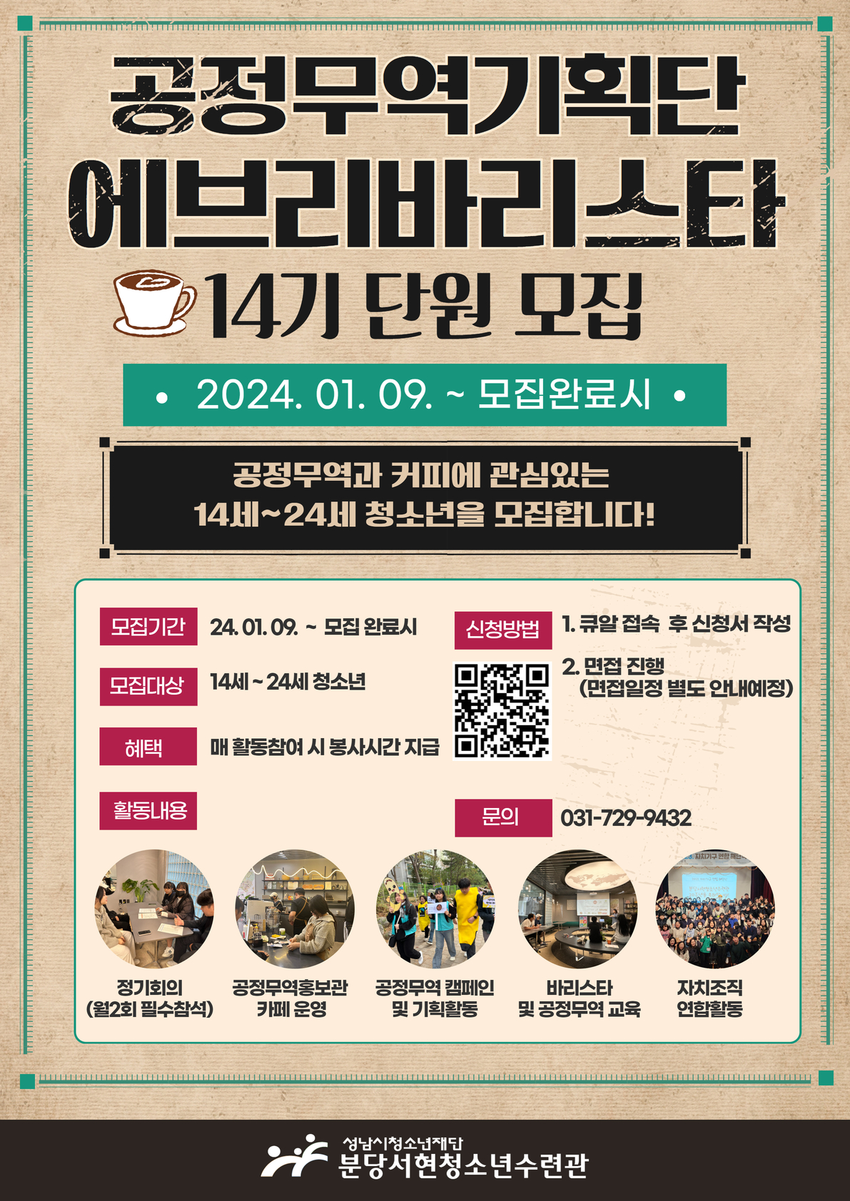 내용: 분당서현청소년수련관에서 제14기 공정무역기획단 『에브리바리스타』 신규 단원을 모집합니다.