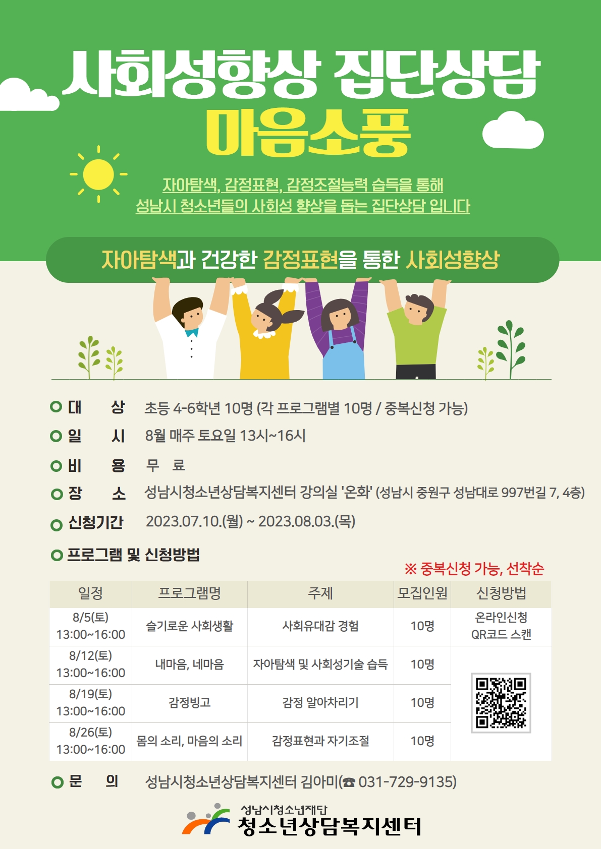 성남시청소년상담복지센터 사회성향상 집단상담 '마음소풍' 모집