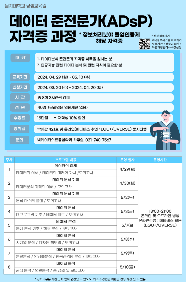 대상: 1. 데이터분석 준전문가 자격증 취득을 원하는 분, 2. 인공지능 관련 데이트 분석 및 관련 지식이 필요한 분