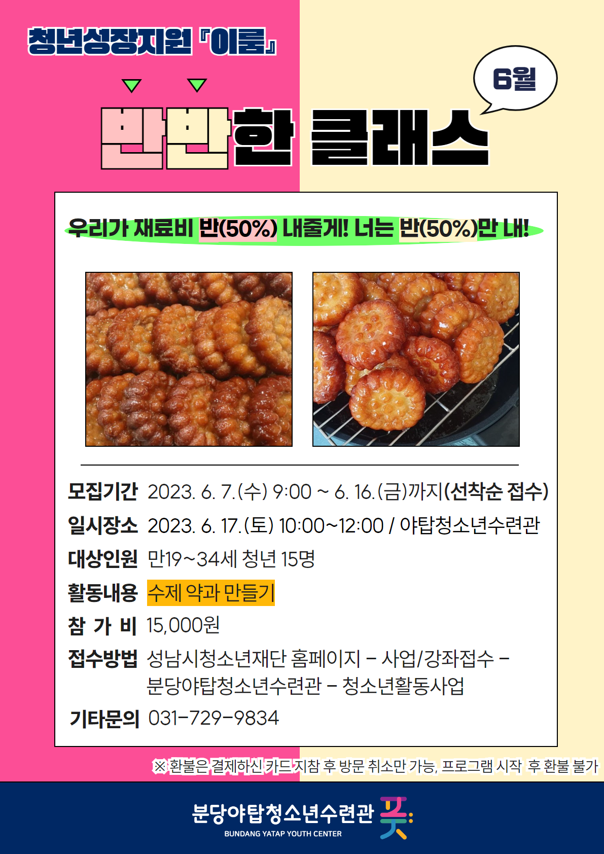 - 접수방법: 성남시청소년재단 홈페이지 - 사업/강좌접수 - 분당야탑청소년수련관 - 청소년활동사업 - 이룸 반반한 클래스